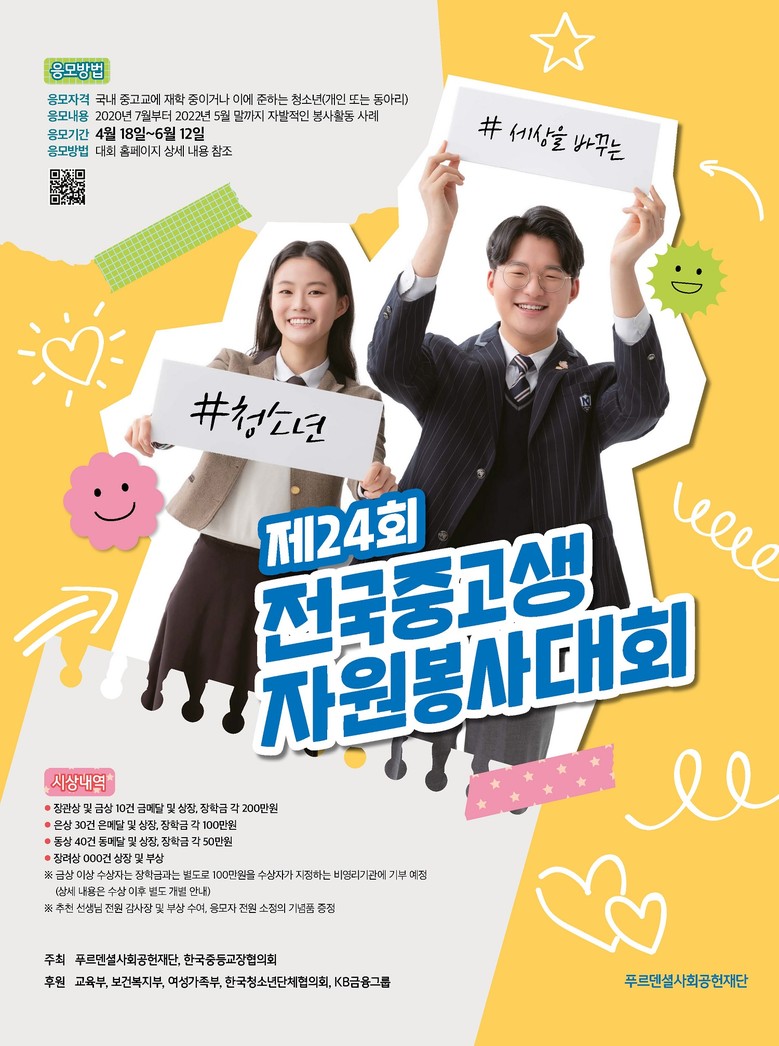 푸르덴셜사회공헌재단과 한국중등교장협의회가 공동으로 주최하는 ‘전국중고생자원봉사대회’는 우리 사회를 보다 살기 좋은 곳으로 만들기 위해 노력하고 있는 청소년자원봉사자들을 발굴해 사회의 참된 리더로 성장할 수 있도록 격려하고 시상하는 프로그램이다.