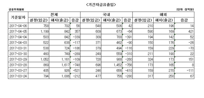 새로 들어온 금액은 548억원, 펀드 환매로 빠져나간 자금은 506억원이다. 공모펀드에서 135억원 줄었고 사모펀드에서 176억원 늘었다.