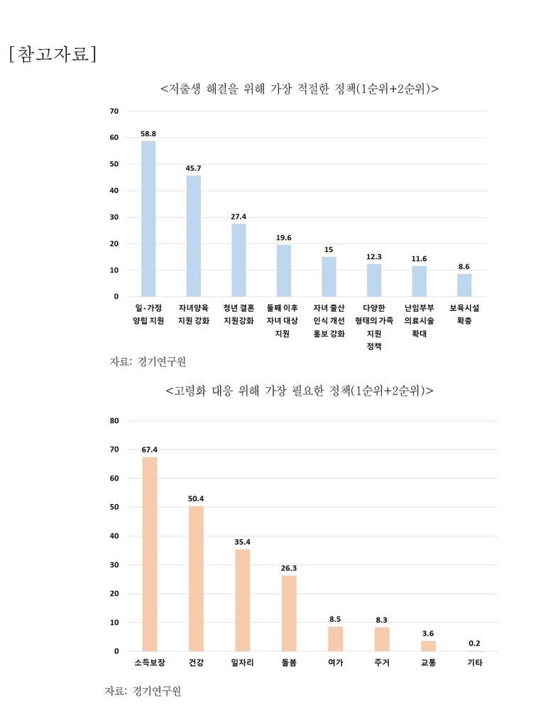 경기연구원은 저출생・고령사회에 대응하기 위한 인구정책 마련을 위해 지난 6월 말부터 10일간 설문조사를 실시했다. 설문은 만 19세 이상 경기도 거주 부모 602명을 대상으로 한 저출생 관련 조사, 만 50세 이상 경기도 거주 613명을 대상으로 한 고령화 관련 조사로 진행됐다.