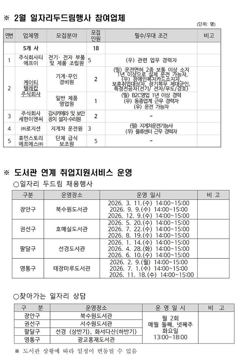 수원일자리센터가 주관하는 ‘일자리 두드림’은 취업에 어려움을 겪는 구직자와 인재 채용을 원하는 기업을 연결해 주는 소규모 채용 행사다. 구직자들이 채용 행사장을 쉽게 찾아올 수 있도록, 올해는 접근성이 좋은 도서관과 연계‧협업해 행사를 열고 있다.