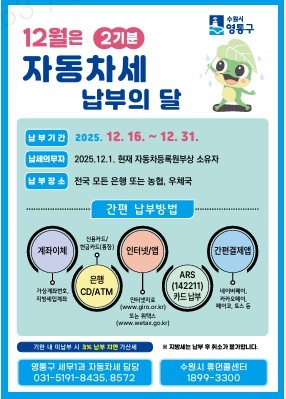 영통구 자동차세 담당자는 “기한 내 납부하지 않을 경우 세액의 3%에 해당하는 가산세를 추가로 부담해야 하므로, 잊지 말고 12월 31일까지 납부해주시기를 바란다”고 당부하였다.