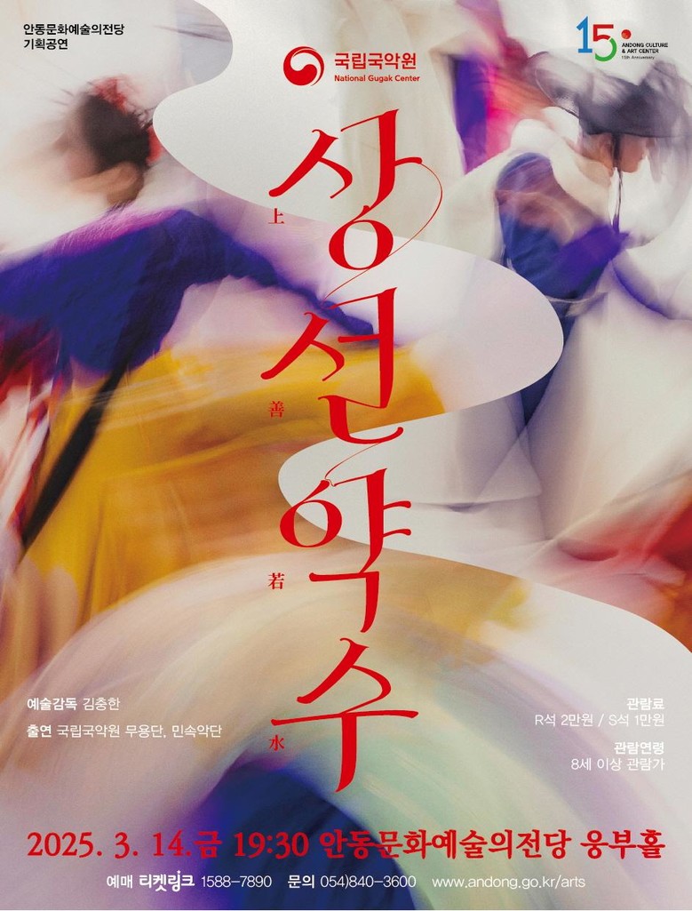 국립국악원 무용단 ‘상선약수’는 R석 2만 원, S석 1만 원으로 8세 이상 관람이 가능하며, 자세한 사항은 전화(☎ 054-840-3600)로 문의하거나 안동문화예술의전당 누리집(http://www.andong.go.kr/arts)에서 확인할 수 있다.