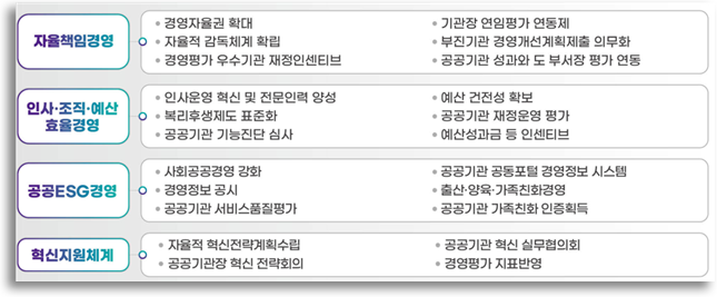 또한, 하반기부터는 공공기관의 운영 실태를 부문별로 진단하는 공공기관 기능 및 재정진단 평가를 시행해, 도정 전반의 유사·중복 기능을 조정한다. 다음 연도 경영평가에는 혁신과제 이행 성과와 노력 정도를 반영해 공공기관 혁신에 대해 엄정한 평가를 진행한다.