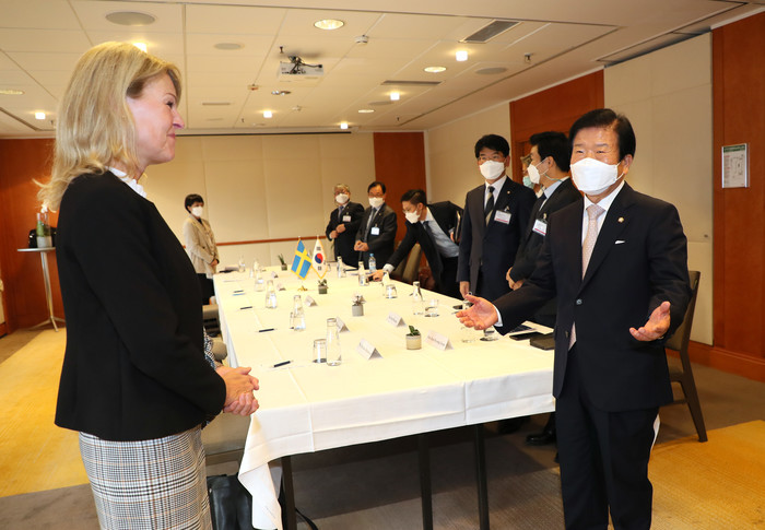 박 의장은 또 “작년 수교 60주년을 맞아 양국 정상이 두터운 신뢰를 쌓았다”며 “수교 61년을 맞은 올해 국회의장의 첫 방문이 새로운 한·스웨덴 60년을 만드는 도약이 되길 희망한다”고 덧붙였다.