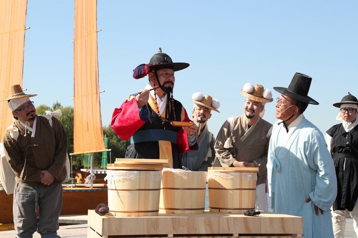 [황포돛배 입항재현] 19일(금) 오전 서울월드컵경기장 평화의 광장에서 열린 '제11회 마포나루 새우젓축제'에 유동균 마포구청장이 사또복장을 입고 등장했다. 이날 유 구청장은 옛날 마포나루터에 각지의 새우젓이 들어오는 모습을 표현한 '황포돛배 입항재현식'에 사또 역할로 직접 참여해 함께 마당극을 펼쳤다.