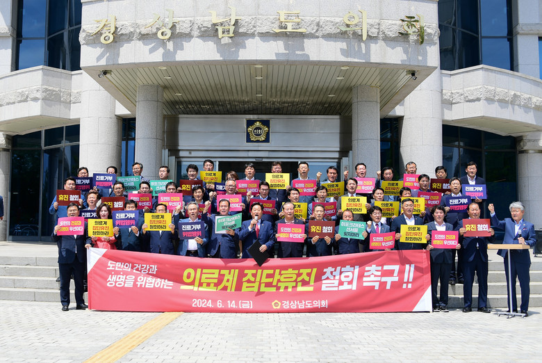 [경남 세계타임즈=최성룡 기자] 경상남도의회 김진부 의장을 비롯한 도의원 전원은 6. 14.(금) 도의회 현관 앞에서 성명서를 발표하고 오는 6월 18일로 예고된 의료계 집단 휴진 결정과 관련해 국민의 건강과 생명을 담보로 하는 집단휴진 방침을 즉각 철회할 것과 생명을 지키는 의사로서의 직업적 가치와 사명감으로 경상남도의사회가 지역 의료현장을 지켜줄 것을 간곡히 요청하였다.