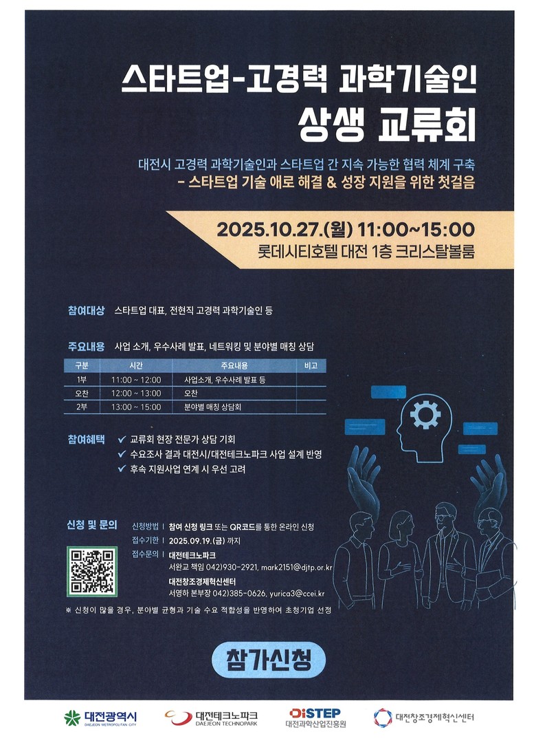 대전시가 지역 스타트업의 기술 애로 해결과 혁신 생태계 강화를 위해「스타트업 고경력 과학기술인 상생 교류회」를 오는 10월 27일(월) 오전 11시 롯데시티호텔에서 개최한다.