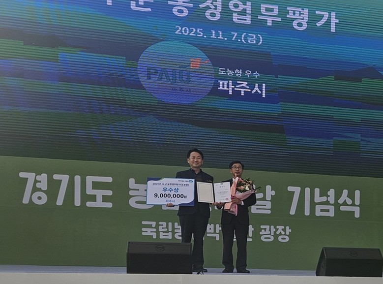 [파주시 세계타임즈=송민수 기자] 파주시는 지난 7일 수원시 국립농업박물관에서 열린 ‘제30회 경기도 농업인의 날 기념식’에서 ‘2025년 경기도 시군 농정업무평가’ 2년 연속 우수기관으로 선정됐다고 밝혔다.