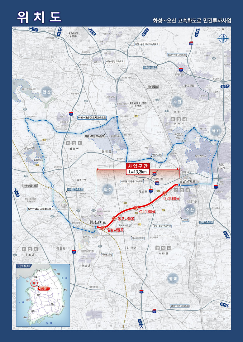 이 사업은 화성시 향남읍에서 오산시 금암동까지 약 13.3km 구간을 연결하는 왕복 4차로 자동차전용도로를 건설하는 것으로, 개통 시 수도권 서남부 지역의 교통 혼잡 해소와 이동 시간 단축, 산업·주거지역 접근성 개선에 크게 기여할 것으로 기대된다.