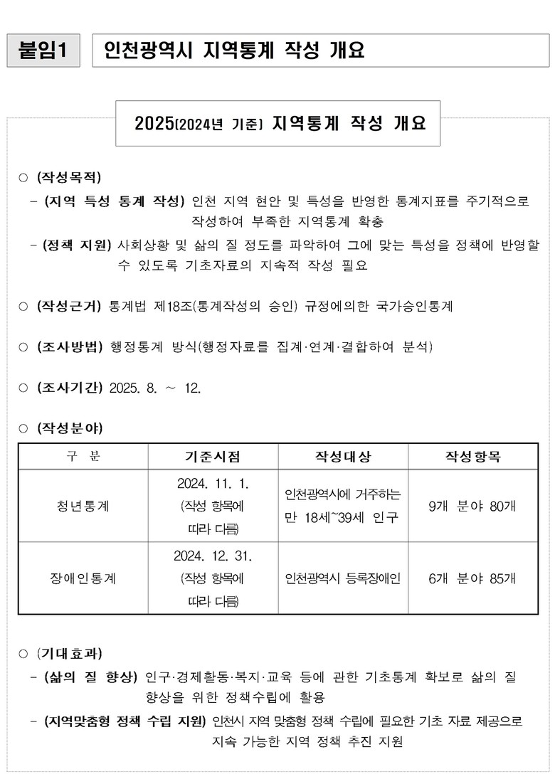 송태진 시 정책기획관은 “청년과 장애인 통계는 인천시 주요 정책 대상 계층의 생활 실태를 객관적으로 파악할 수 있는 핵심 기초자료”라며, “앞으로도 지역 특성을 반영한 통계를 지속적으로 구축·발굴하여 시민 체감형 정책 수립에 적극 활용해 나가겠다”라고 밝혔다.