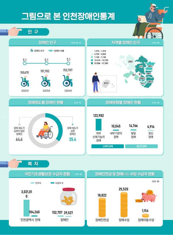 인천시 장애인 인구가 지속적으로 증가하고 있다. 2024년 기준 인천시 장애인 인구는 152,707명으로 전체 인구의 5.1%를 차지했으며, 전년 대비 925명 증가했다. 성별로는 남자가 59.3%, 여자가 40.7%를 차지했으며, 군·구별로는 부평구가 27,395명으로 가장 많았고, 장애인 비율은 강화군이 8.4%로 가장 높았다.