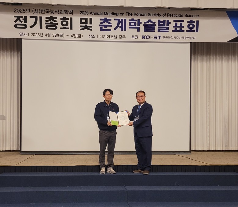 [경북 세계타임즈=한윤석 기자] 경상북도농업기술원 농식품환경연구과 김민기 박사가 최근 경주시에서 개최된 ‘2025년 한국농약과학회 춘계학술발표회’에서 연구논문 우수발표상을 수상하는 영예를 안았다.