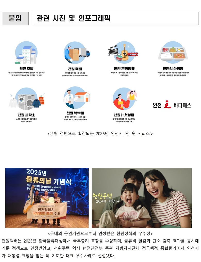 2025년 한 해 동안 시민의 뜨거운 호응과 높은 미디어 관심 속에 인천시를 대표하는 민생 체감 정책으로 자리 잡은 ‘천원 시리즈’는, 2026년 신규 정책 도입과 기존 사업의 고도화를 통해 한 단계 더 진화한다.