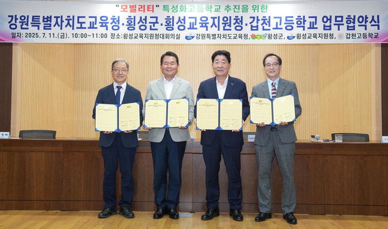 [강화군 세계타임즈=김민석 기자] 강원특별자치도교육청(교육감 신경호), 횡성군(군수 김명기), 횡성교육지원청(교육장 심영택), 갑천고등학교(교장 권상문)는 7월 11일(금) 오전 10시, 횡성교육지원청 대회의실에서 미래 모빌리티 산업을 선도할 전문 인력 양성과 지역산업 맞춤형 특성화고(이하 강원모빌리티고) 추진을 위한 4자 간 업무협약(MOU)을 체결하였다.