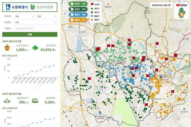2024년에는 곳곳에 조성한 새빛수원 손바닥정원의 정보를 한눈에 볼 수 있는 온라인 지도 ‘지도로 보는 손바닥정원’을 구축했다. 손바닥정원 위치가 수원시 지도 위에 점으로 표시돼 있다.