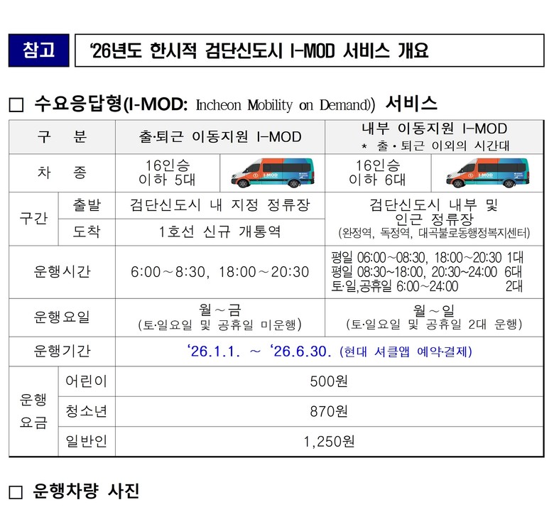 장철배 시 교통국장은 “이번 수요응답형 버스(I-MOD)의 한시적 연장 운영으로 검단신도시 주민들의 출퇴근은 물론 일상 이동 편의가 크게 향상될 것”이라며, “앞으로도 주민 의견을 적극 반영해 대중교통 이용 불편을 해소하고, 시민 교통복지 증진을 위해 지속적으로 노력하겠다”라고 말했다.