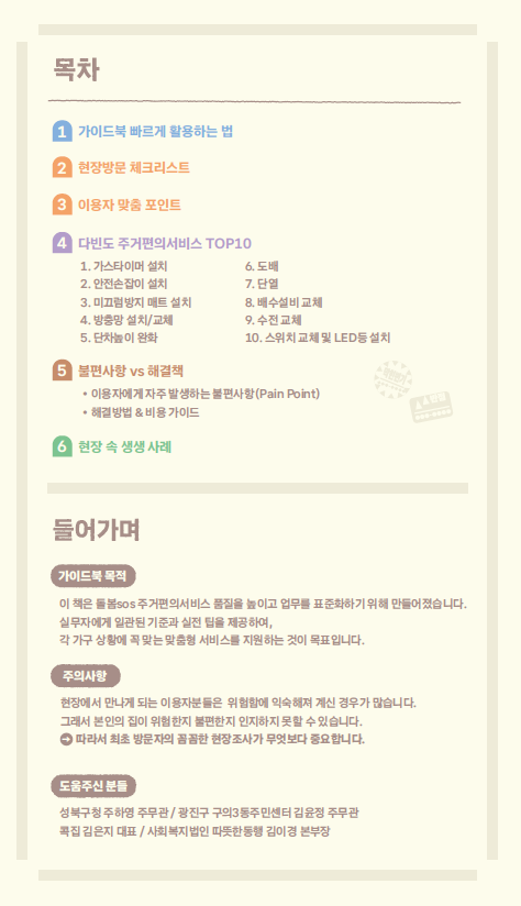 이번 가이드북은 고령자, 장애인 등 돌봄이 필요한 시민의 주거 불편사항을 개선하기 위한 실무자용 지침서로, 현장 중심의 품질관리 체계와 표준화된 서비스 기준을 제시하는 것을 목표로 한다.