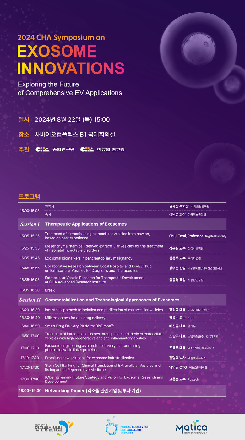 심포지엄은 권세창 차의료원 R&D사업화총괄 부회장의 환영사와 한국엑소좀학회 김완섭 회장의 축사를 시작으로 총 2개의 세션으로 구성된다. 첫째 세션은 ‘엑소좀 치료의 응용’을 주제로 △세포 외 소포를 이용한 간경변 치료의 과거와 현재(일본 니가타 대학교 슈지 테라이 교수) △신생아 난치성 질환의 중간엽 줄기세포 유래 세포 외 소포 치료(삼성서울병원 소아청소년과 장윤실 교수) △췌장, 담도의 악성 종양 엑소좀 바이오마커(구미차병원 소화기내과 김동욱 교수) △세포 외 소포 진단 및 치료를 위한 지역 병원과 한국 의료 허브구축을 위한 공동 연구(대구경북첨단의료산업진흥재단 성수은 선임) △차종합연구소의 세포 외 소포 치료 개발을 위한 연구(차종합연구원 성동경 책임) 강연이 진행된다.