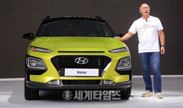 현대자동차 첫 글로벌 소형 SUV '코나' 출시 기념 월드 프리미어 행사가 열린 13일 오전 경기 고양시 일산구 현대 모터스튜디오에서 정의선 현대차 부회장이 신차 '코나'를 직접 소개하고 있다. 2017.06.13.