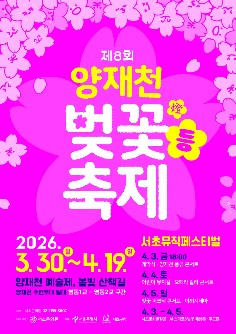 전성수 서초구청장은 “이번 축제가 서초의 문화예술 역량을 보여주는 대표적인 지역 축제로 자리 잡길 기대한다”며 “많은 분이 양재천의 봄 정취 속에서 행복한 시간을 보내시길 바란다”고 말했다.