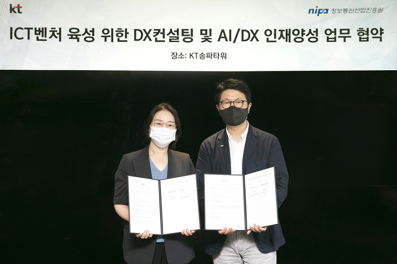 KT와 NIPA는 이번 협약을 통해 ▲정보통신기술(ICT) 신사업 분야 중견·중소·벤처기업 육성 ▲교육 및 자격 분야 AI·DX 인재 양성을 함께 추진하기로 했다.