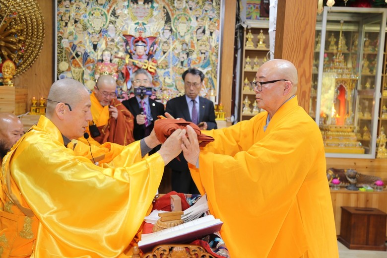 세계불교교황청장 능인스님은 석가여래 정법안장 77세 석담스님, 혜광스님,78세 곡담스님, 경산스님, 거불스님, 청명스님에게 전법게를 설하고 전법을 증명하는 대가사, 장삼, 발우, 전법게, 장실, 계보를 전달했다.