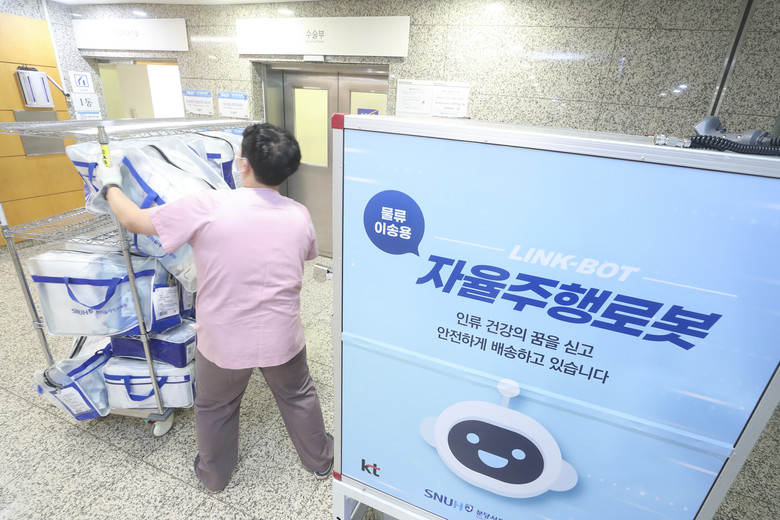 기존에는 두 건물 간 1.5km 거리를 차량으로 다니며 물품을 이송했다. 하역장에서 병동까지 엘리베이터를 타고 무거운 카트를 끌고 다니는 것은 당연히 사람의 몫이었다. 이제는 물품을 카트에 채워놓기만 하면 무거운 카트는 자율주행 이송로봇이 옮긴다. 혼잡한 주간 시간을 피해 야간배송으로 환자와 겹치는 동선을 최소화하여 환자안전을 지키고 감염의 위험도 줄였다.