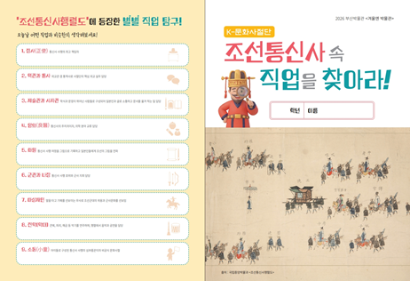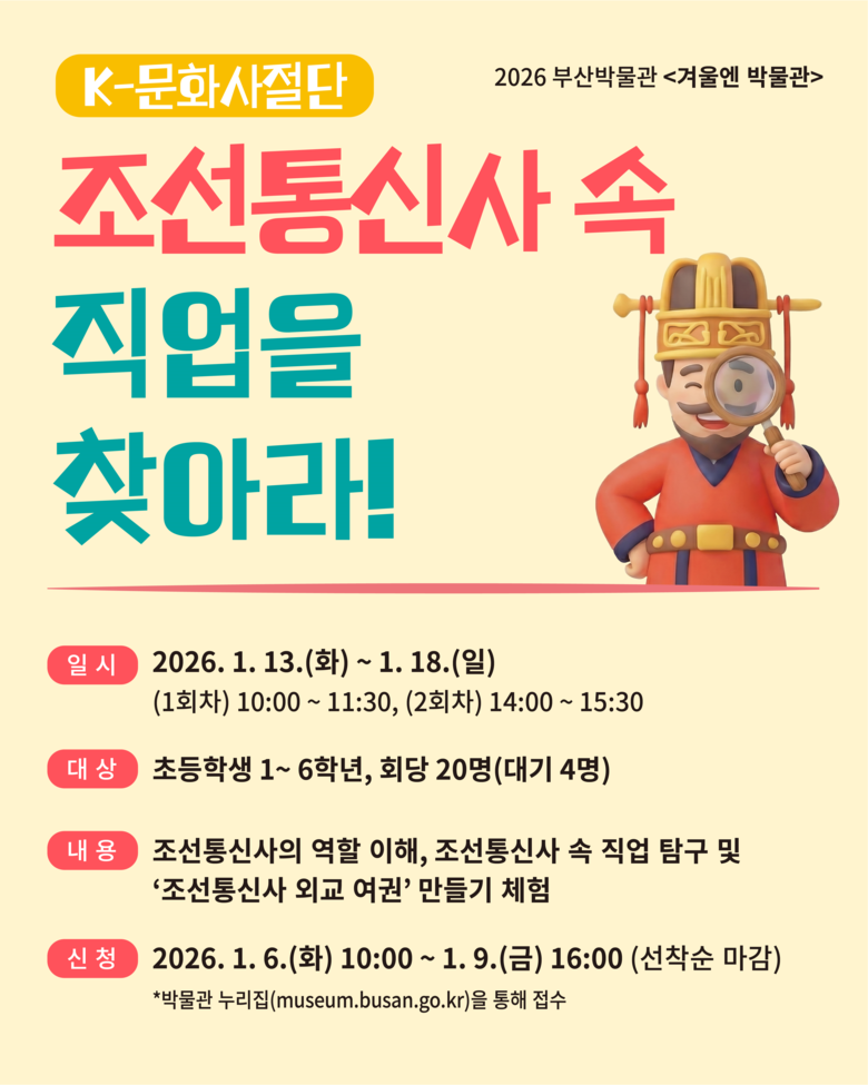 ◈ 참가 신청은 1.6. 10:00부터 시 통합예약시스템에서 선착순 접수로 진행돼 [부산 세계타임즈=이용우 기자] 부산시립박물관(이하 부산박물관)은 2026년 겨울엔 박물관, 「케이(K)-문화사절단, 조선통신사 속 직업을 찾아라!」를 오는 1월 13일부터 1월 18일까지 운영한다고 밝혔다.