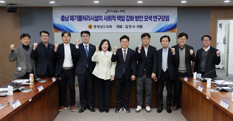 김민수 의원(비례·더불어민주당)이 연구모임 대표를, 충남도 환경관리과 폐기물관리팀 윤태근 팀장이 간사를 맡았으며, 충남도의회 신순옥 의원(비례·국민의힘), 박정수 의원(천안9·국민의힘), 정병인 의원(천안8·더불어민주당), 한국환경공단 충청권환경본부 한행석 부장, 충남개발공사 환경사업부 박주관 부장, 공익법률센터 농본 하승수 변호사, 사회적협동조합 금강 정종관 이사장, 충남도 환경관리과 황은성 과장, 대기환경과 도중원 과장 등 11명으로 구성됐다.