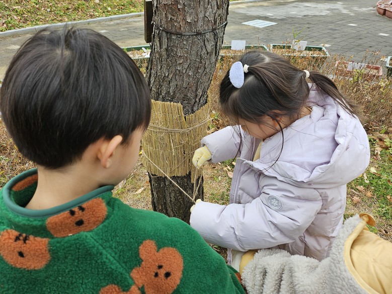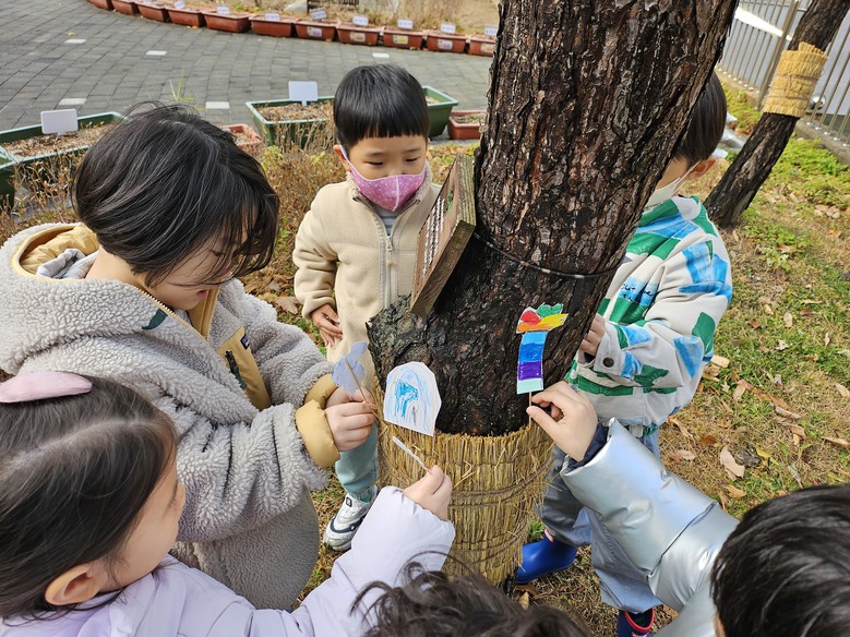 먼저 유아들과 함께‘식물이 겨울을 나는 방식’과 지푸라기를 활용한 잠복소(보온 덮개)의 개념을 설명하고, 활동의 구체적인 방법과 유의사항(나무 손상 방지. 안전거리 유지 등)을 이야기한 후 프로젝트를 시작하였다. 이후 각 모둠은 자신들이 정한 나무 주변에 지푸라기를 둘러 감고 끈으로 묶는 방식으로 따뜻한 ‘옷’을 입히는 잠복소를 입혀주고 그림과 사랑의 메시지를 선물하며 추운 겨울을 잘 이겨낼 수 있도록 나무에게 힘을 주며 정서적으로 교감을 나누었다.
