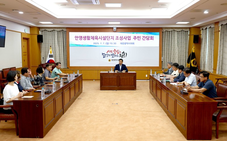 [대전 세계타임즈=이채봉 기자] 대전시의회는 민경배 의원(국민의힘, 중구3) 주재로 7일 시의회 소통실에서 ‘안영생활체육시설단지 조성사업 주민간담회’를 열고 사업 추진 현황 공유 및 소통의 시간을 가졌다.