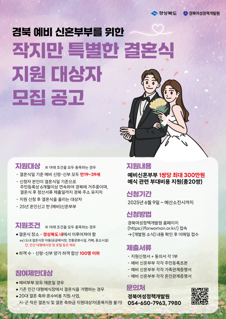 한편, 경북도는 민간 예식장이 아닌 다양한 장소에서 양가 합산 100명 이하의 결혼식에 최대 300만원의 결혼식 비용을 지원하는 ‘작지만 특별한 결혼식’사업을 시행하고 있다. 자세한 사항은 주관기관인 경북여성정책개발원에 문의하면 된다.