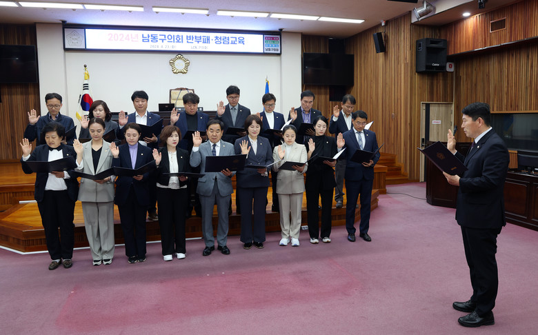 교육에 앞서 본회의장에서 진행된 ‘청렴 실천 서약식’ 에서 남동구의회 전용호 윤리특별위원회 위원장이 대표로 서약서를 낭독하였다. 서약서에는 구의회 공직자로서 공직사회의 부정부패를 예방하고 청렴·공정한 남동구를 만드는데 모범이 되겠다는 내용이 담겼다.