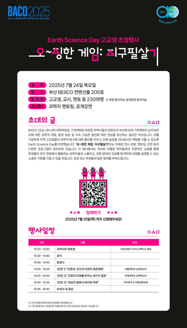 오는 24일에는 청소년과 교사를 위한 과학 교육 프로그램인 「어스 사이언스 데이(Earth Science Day)」가 벡스코에서 열린다. ‘오~징한 게임: 지구 필살기’를 주제로 서울대, 국립부경대, 극지연구소 등 저명한 과학자들이 참여해 강연과 상담(멘토링)을 통해 참가 학생들과 진로·학문에 대해 심도 있는 대화를 나눌 예정이다.
