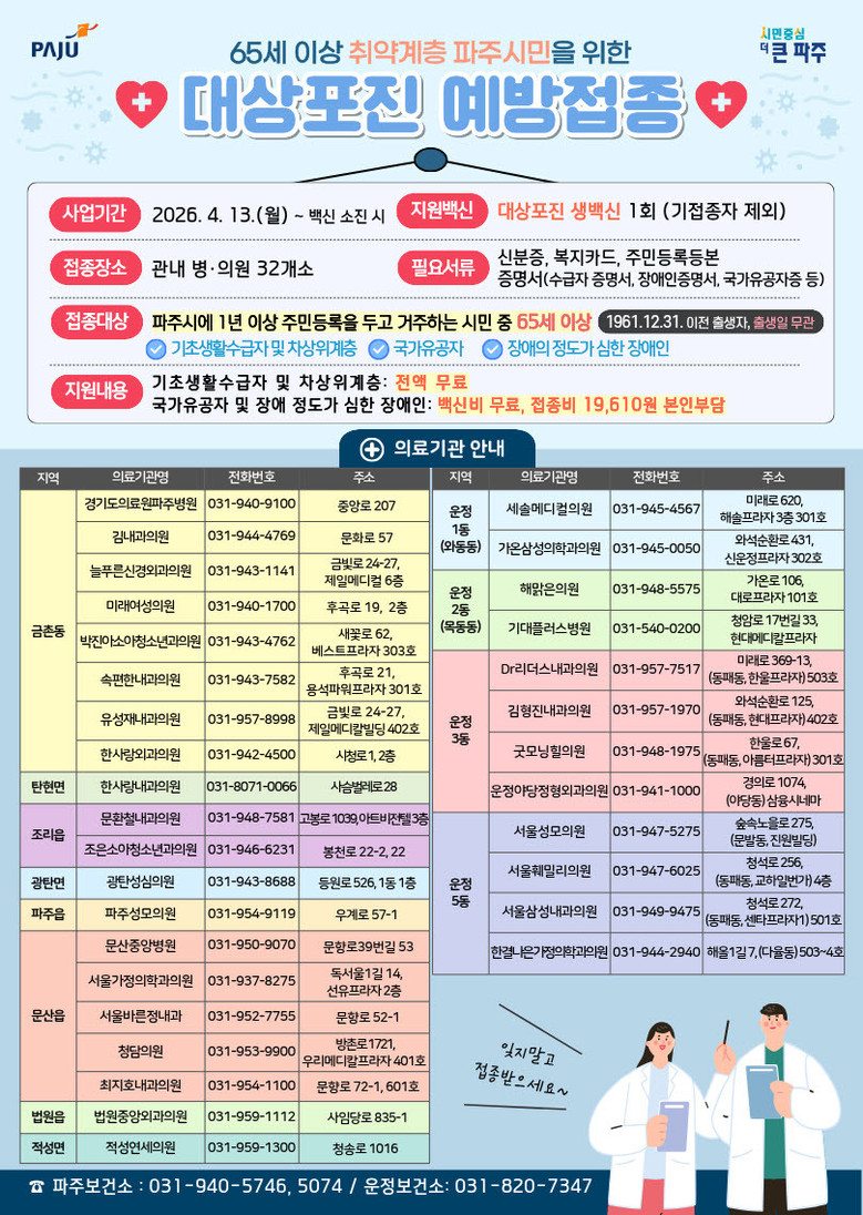 접종이 가능한 위탁의료기관은 시청 누리집에서 확인할 수 있으며, 자세한 사항은 보건소로 전화 문의 후 안내받을 수 있다. 지원 대상은 지난해까지 65세 이상 ▲기초생활수급자 ▲차상위계층에 국한돼 있었으나, 올해부터는 ▲국가유공자 ▲장애의 정도가 심한 장애인까지 확대해 실시한다. 이에 따라 파주 시민 약 1,400명이 이번 사업의 대상자로 혜택을 받게 될 것으로 전망된다.
