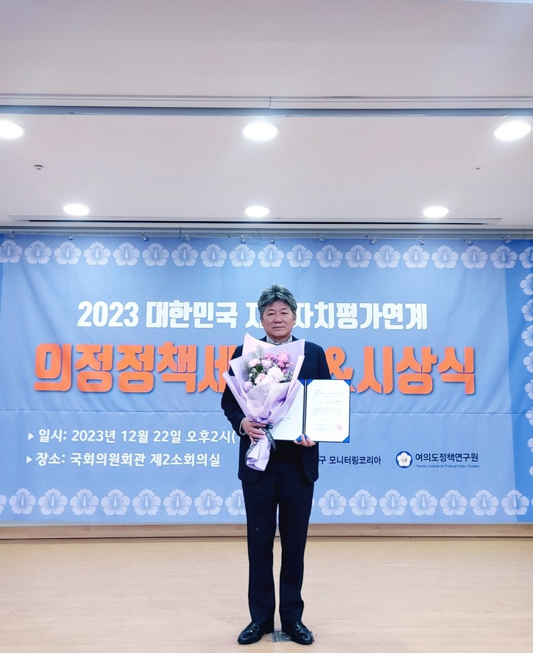여의도정책연구원이 주관한 ‘지방자치평가 의정정책대상’은 지방자치제도 활성화와 삶의 질 향상, 경쟁력 있는 지역발전 시책, 지역민원 및 현안문제 해결 등 지방자치 활성화를 위해 주민행복정책을 펼친 우수의원에게 수여하는 상이다.