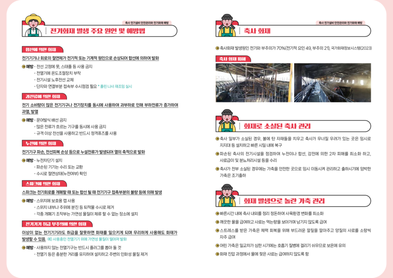 도는 농장규모에 맞는 전력사용, 축사 내외부의 전선 피복상태 점검, 먼지나 거미줄 제거, 축사 전기설비 및 전기기구의 정기적인 점검 실시와 함께 가축재해보험 가입 시 가축과 축사까지 가입하도록 안내하고 있다.