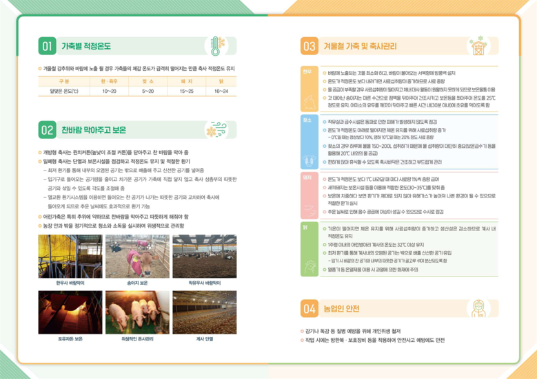 이밖에도 겨울철 재해 예방을 위한 가축관리, 시설물 관리요령, 전기화재 예방 리플릿을 배포하여 지속적인 피해예방 요령을 홍보할 예정이다.