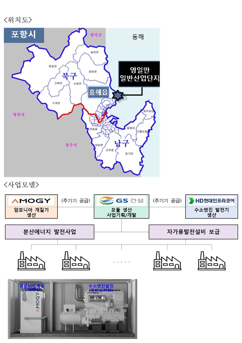 포항 모델은 청정 암모니아 기반 무탄소 분산에너지 실증사업으로서, 영일만 산업단지를 중심으로 청정 암모니아 기반의 수소엔진발전 실증을 통해 40MW급의 무탄소 분산전원을 상용화해 청정전력을 공급한다는 계획이다.