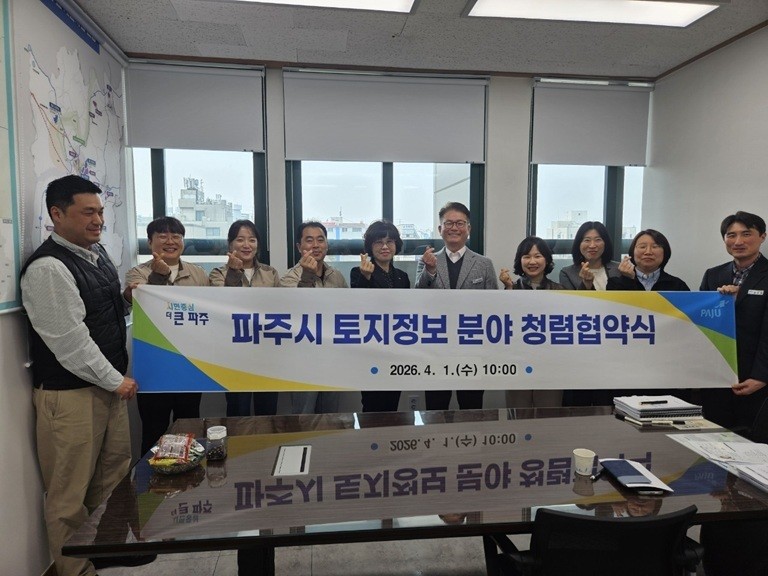 [파주시 세계타임즈=송민수 기자] 파주시는 지난 1일 지적측량 수행기관인 한국국토정보공사 파주지사와 ‘토지정보 분야 청렴협의체’를 구성하는 내용으로 협약을 체결했다.