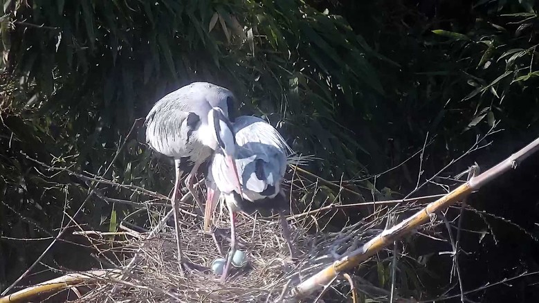 이어 지난 3월 21일에는 암컷 왜가리(머리 깃이 짧음)가 1개의 알을 낳는 장면이 포착됐으며, 27일 오후 2시 50분경 두 번째 알을 낳는 장면이 관찰됐다. 29일에는 세 번째 알을 낳아 암수가 교대로 알을 품기 시작했다.