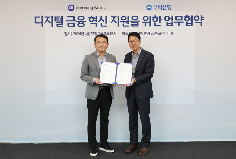우리은행은 23일 삼성전자와 ‘디지털 금융 혁신 지원을 위한 업무협약’을 체결하고 대학 학생증 카드와 삼성월렛을 연계한 서비스를 제공하기로 했다.
