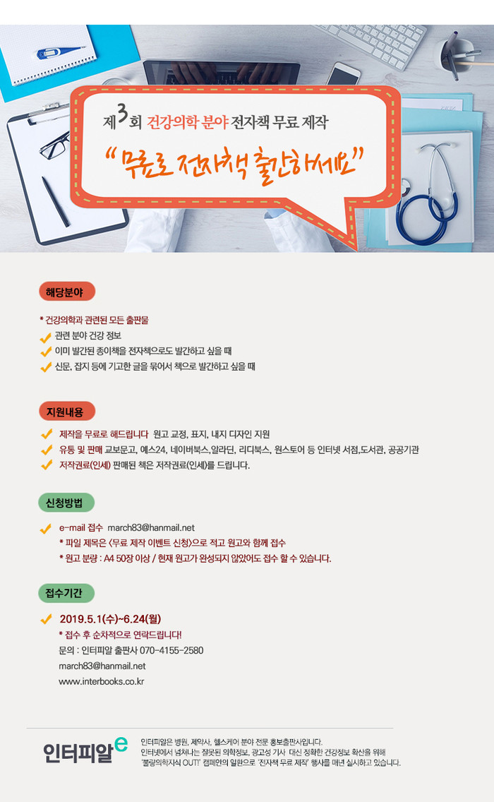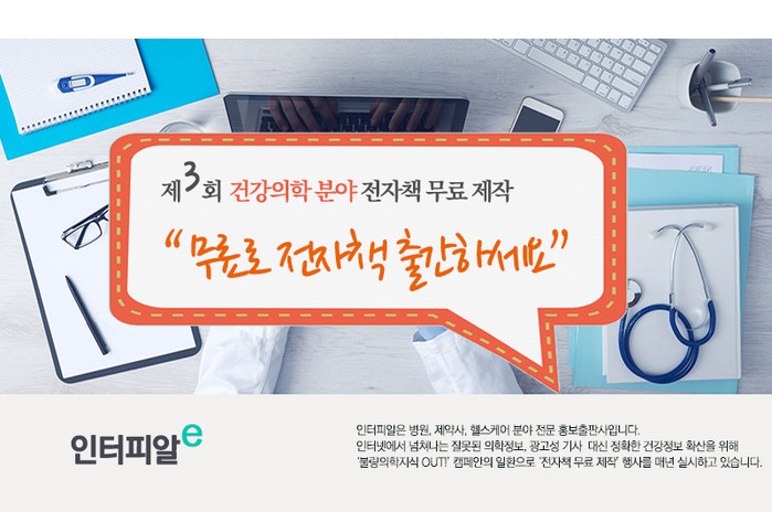 분야는 건강, 의학과 관련된 모든 출판물로, 이미 발간된 종이책을 전자책으로 다시 발간하고 싶거나, 미발표 원고를 책으로 만들고 싶다면 응모해볼 수 있다. 분량은 A4용지 기준 50페이지 이상이다.