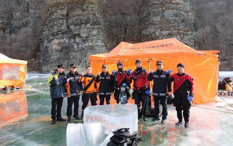 특히 4일부터 6일까지는 안동시 도산면 가송리 고리천 일원에서 실제 겨울철 수난 상황을 가정한 실전 중심의 현장 훈련이 이어졌다. 훈련에서는 ▴빙판을 깨고 입수하는 구조와 인양 절차 ▴수중 수색과 수중 통신 실습 ▴구조대원 위기 상황 발생 시 안전 확보 절차 등을 중점적으로 점검하며 실전 대응 능력 강화에 중점을 뒀다.