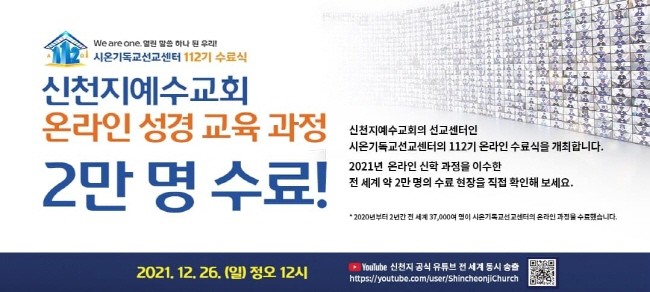 신천지예수교회는 오는 26일 시온기독교선교센터 112기 온라인 수료식을 개최하고 총 1만 8천838명(국내 1만 1천162명, 해외 7천676명)의 수료생을 배출한다고 20일 밝혔다. 26일 정오부터 진행되는 수료식은 신천지예수교회 공식 유튜브를 통해 전 세계로 중계된다.