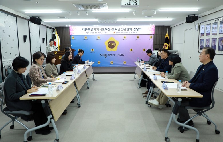 [세종 세계타임즈=이채봉 기자] 세종특별자치시의회(의장 임채성) 교육안전위원회(위원장 윤지성)는 2일, 세종시의회 1층 대회의실에서 세종특별자치시교육청과 간담회 시간을 가졌다. 이번 간담회에는 교육안전위원회 위원 전체와 구연희 세종시교육청 교육감 권한대행, 교육국장, 행정국장, 정책국장, 소통담당관, 미래기획관이 함께 참석했다.