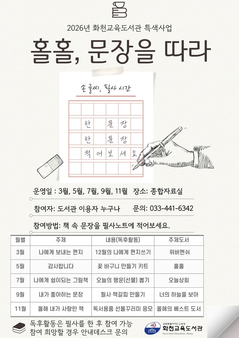 자세한 사항은 화천교육도서관 누리집 공지 사항을 참고하거나 종합자료실(☎ 033-441-6342)로 문의하면 된다.