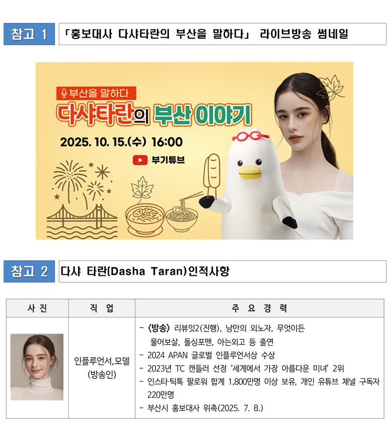 이번 라이브 방송은 '부기'가 진행을 맡아 '홍보대사 다샤 타란이 경험한 부산'을 주제로 시민과 함께하는 양방향 토크쇼 형식으로 진행된다.