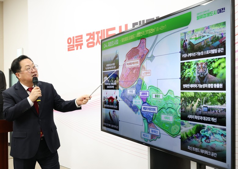 이장우 대전광역시장은 23일 시청 브리핑실에서 ‘보물산 프로젝트’의 일환으로 추진 중인 ‘오월드 재창조사업’ 계획을 발표했다.