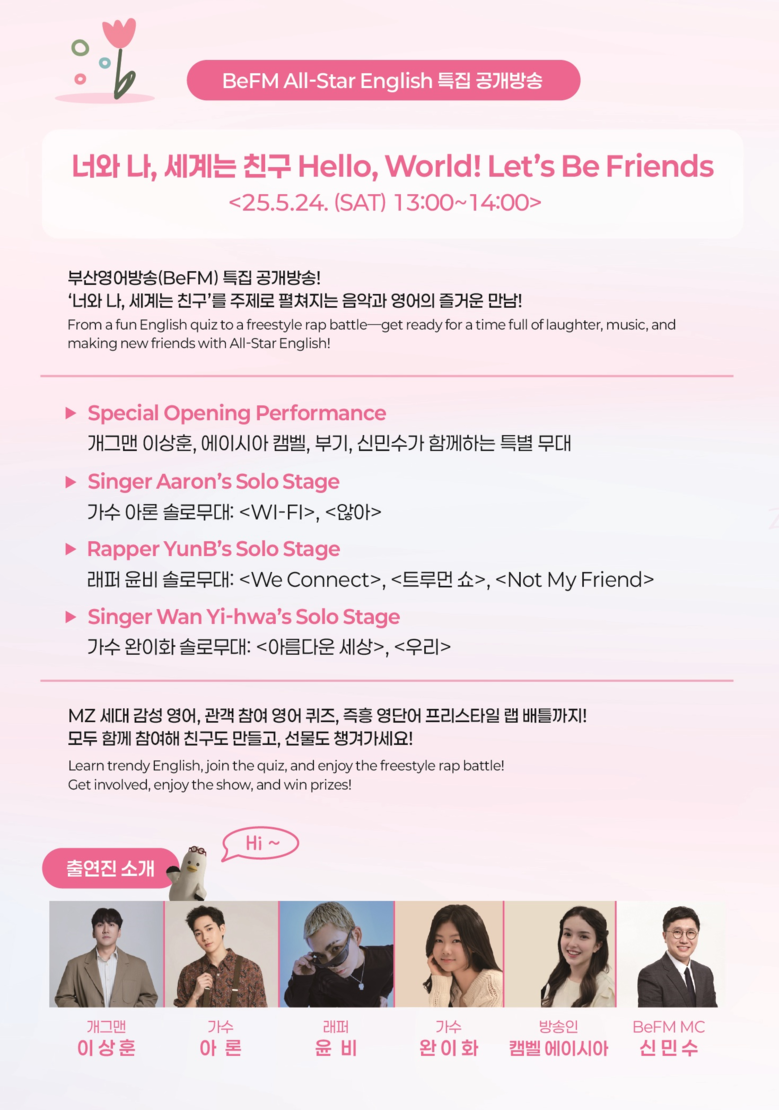 먼저, 부산영어방송(BeFM) 올스타 잉글리시(All-Star English) 특집 공개방송은 <너와 나 세계는 친구(Hello, World! Let's Be Friends)>를 주제로, 영화의전당 메인무대에서 오후 1시부터 2시까지 진행된다.